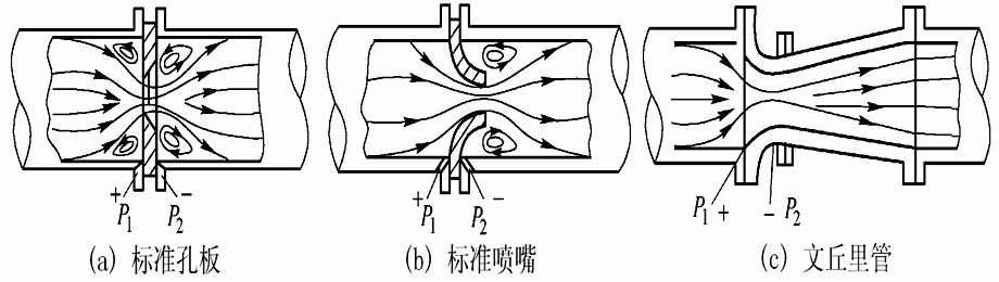 流體流經(jīng)節(jié)流件時(shí),流束收縮引起壓頭轉(zhuǎn)換而在節(jié)流件前后產(chǎn)生靜壓力差,該壓差與流過的流量之間存在一定的關(guān)系,通過測(cè)量壓差而求出流量的一種流量計(jì)通稱節(jié)流裝置,也稱為差壓裝置。節(jié)流裝置結(jié)構(gòu)簡(jiǎn)單,性能穩(wěn)定,使用維護(hù)方便,且有一部分已標(biāo)準(zhǔn)化,是目前應(yīng)用最多的一種流量計(jì)。常用標(biāo)準(zhǔn)節(jié)流裝置有孔板、噴嘴及文丘里管,如下圖所示。