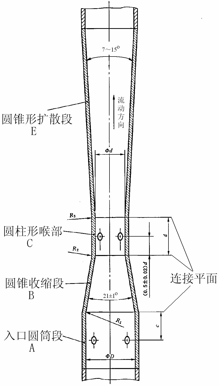 標準文丘里管有兩種形式: 古典文丘里管(簡稱文丘里管,見圖)與文丘里噴嘴。文丘里管是由入口圓筒段A,流量計圓錐收縮段B,圓柱形喉部C以及圓錐形擴散段E組成。文丘里管內壁是對稱于軸線的旋轉表面,該軸線與管道同軸。