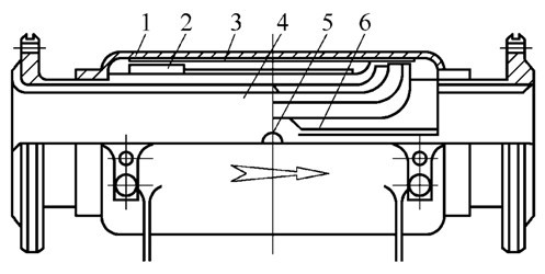 (一) 電磁流量 傳感器結構 電磁流量傳感器由測量管,勵磁系統(勵磁線圈、磁軛等)、電極,內襯和外殼等組成,如圖所示。 1-外殼;2-勵磁線圖;3-磁軛; 4-內襯;5-電極;6-繞組支持件