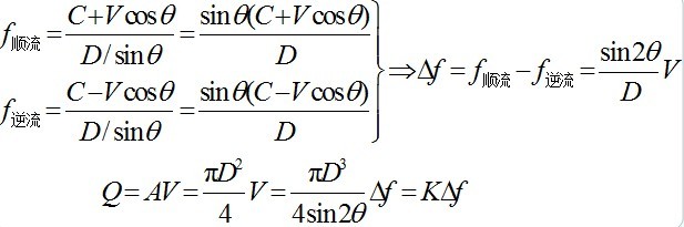 設流體流速為V,管道內徑為D,超聲波束與管軸的夾角為θ,超聲波的靜止流體中的聲速為C。則可得超聲波在順流(p1發射)與逆流(p2發射)方向的傳播頻率差Δf分別,在在此基礎上可得流體的體積流量Q: